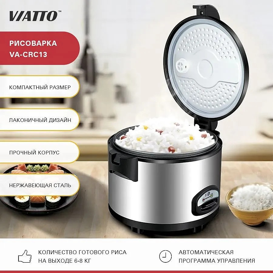 Рисоварка VIATTO VA-CRC13 предназначается для варки и поддержания температурного режим риса и прочих круп на предприятиях общественного питания, торговли и пищевых производствах. Автоматический переход в режим поддержания риса в разогретом состоянии по окончании готовки. Равномерный нагрев позволяет приготовить большое количество риса, не повреждая его структуру. Материал корпуса - нержавеющая сталь, материал чаши - алюминиевый сплав с антипригарным покрытием, материал ручек - безопасный термоизоляционный материал.