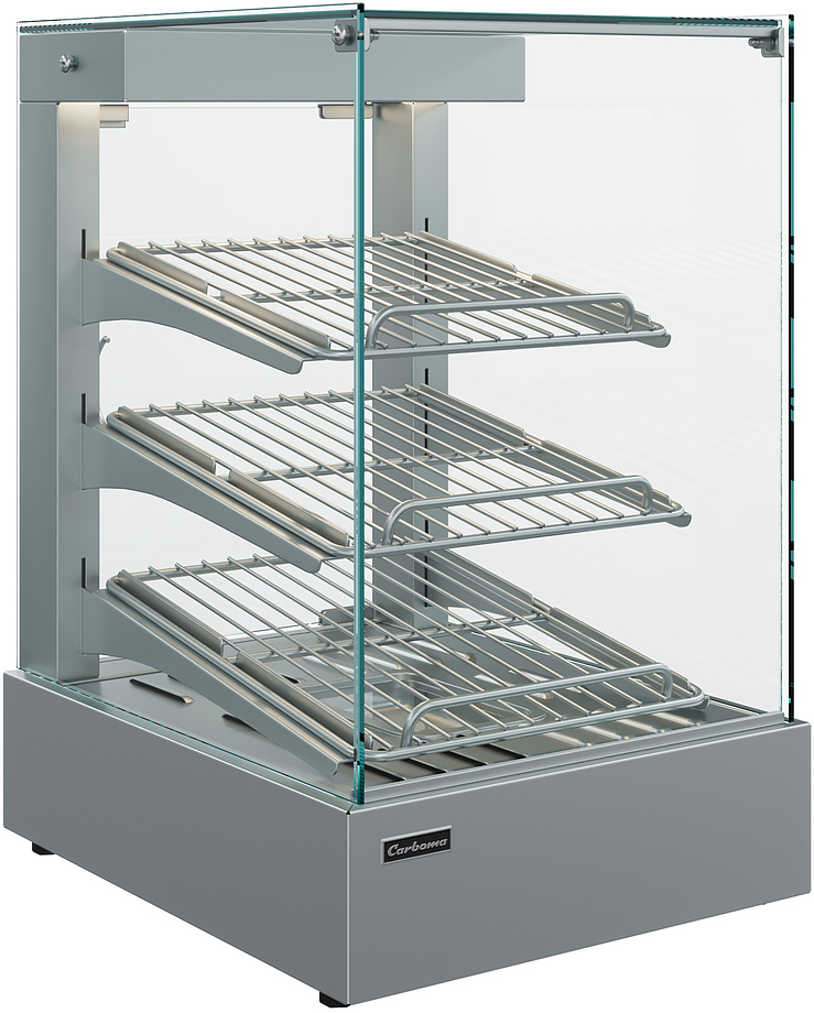 Настольная тепловая витрина Carboma AC45 HWB 0,4-1 используется на предприятиях общественного питания, торговли и пищевых производствах для продажи, демонстрации, кратковременного хранения и поддержки в горячем состоянии готовых блюд, пицц, выпечки и других изделий. Оборудование оснащено системой пароувлажнения (типа мармит), задней распашной створкой, полками-решетками, термометром, термостатом, гастроемкостью для воды, верхней LED-подсветкой, выдвижным поддоном для сбора крошек и регулируемыми ножками. Материал корпуса и полок - высококачественная нержавеющая сталь.