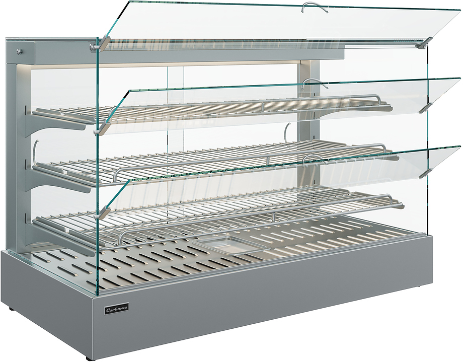 Настольная тепловая витрина Carboma AC45 HWB 0,9-1 (self) используется на предприятиях общественного питания, торговли и пищевых производствах для продажи, демонстрации, кратковременного хранения и поддержки в горячем состоянии готовых блюд, пицц, выпечки и других изделий. Оборудование оснащено системой пароувлажнения (типа мармит), задними створками-слайдерами, полками-решетками, термометром, термостатом, гастроемкостью для воды, верхней LED-подсветкой, выдвижным поддоном для сбора крошек и регулируемыми ножками. Материал корпуса и полок - высококачественная нержавеющая сталь.