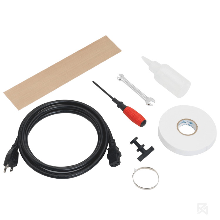 В комплект поставки входят база для вакуумной упаковки, прокладочный лист, пластиковая бутылка с носиком, крестовая отвертка, гаечный ключ, ленточный нагревательный элемент, дополнительный нагревательный элемент.