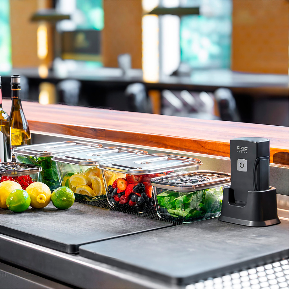 Набор CASO Vacu OneTouch Pro Set используется на предприятиях пищевой промышленности, общественного питания и торговли для герметичной упаковки полуфабрикатов и готовых блюд в пакетах или контейнерах, что способствует продлению их срока хранения. Модель с вакуумным насосом и литий-ионным аккумулятором. Материал корпуса вакууматора - пластик, материал контейнеров - стекло.
