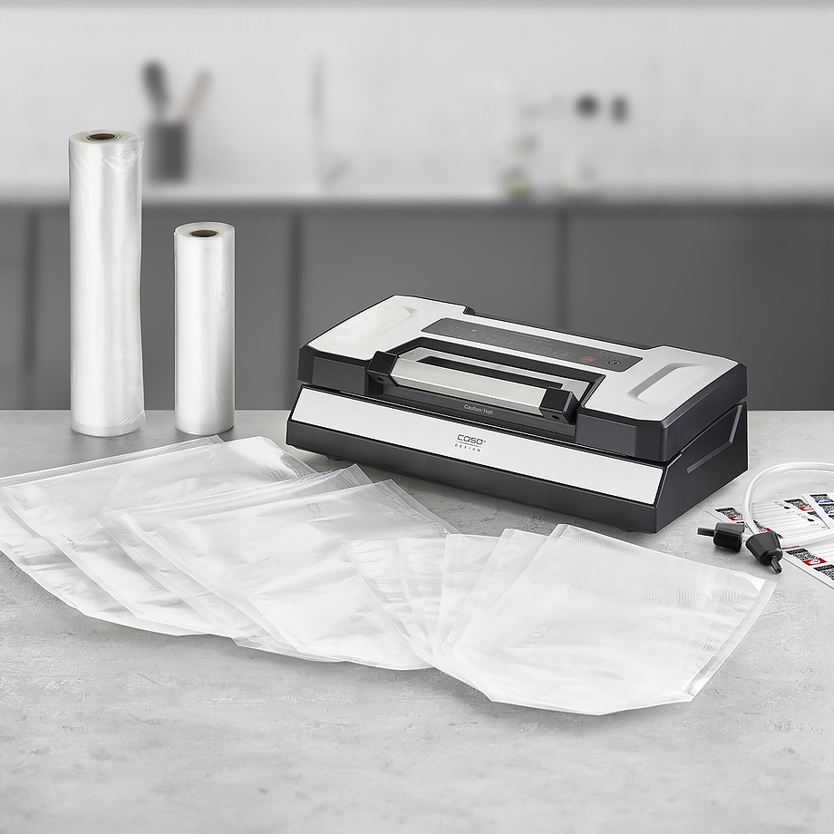 Вакуумный упаковщик CASO VRH 790 advanced используется на предприятиях пищевой промышленности, общественного питания и торговли для герметичной упаковки полуфабрикатов и готовых блюд в пакетах или контейнерах, что способствует продлению их срока хранения. Модель оснащена сенсорным управлением, белым светодиоидным дисплеем, индикацией режимов работы, электронным контроллером температуры сварочного шва, съемным поддоном для сбора влаги и ручкой. Материал корпуса и ручки - высококачественная нержавеющая сталь.